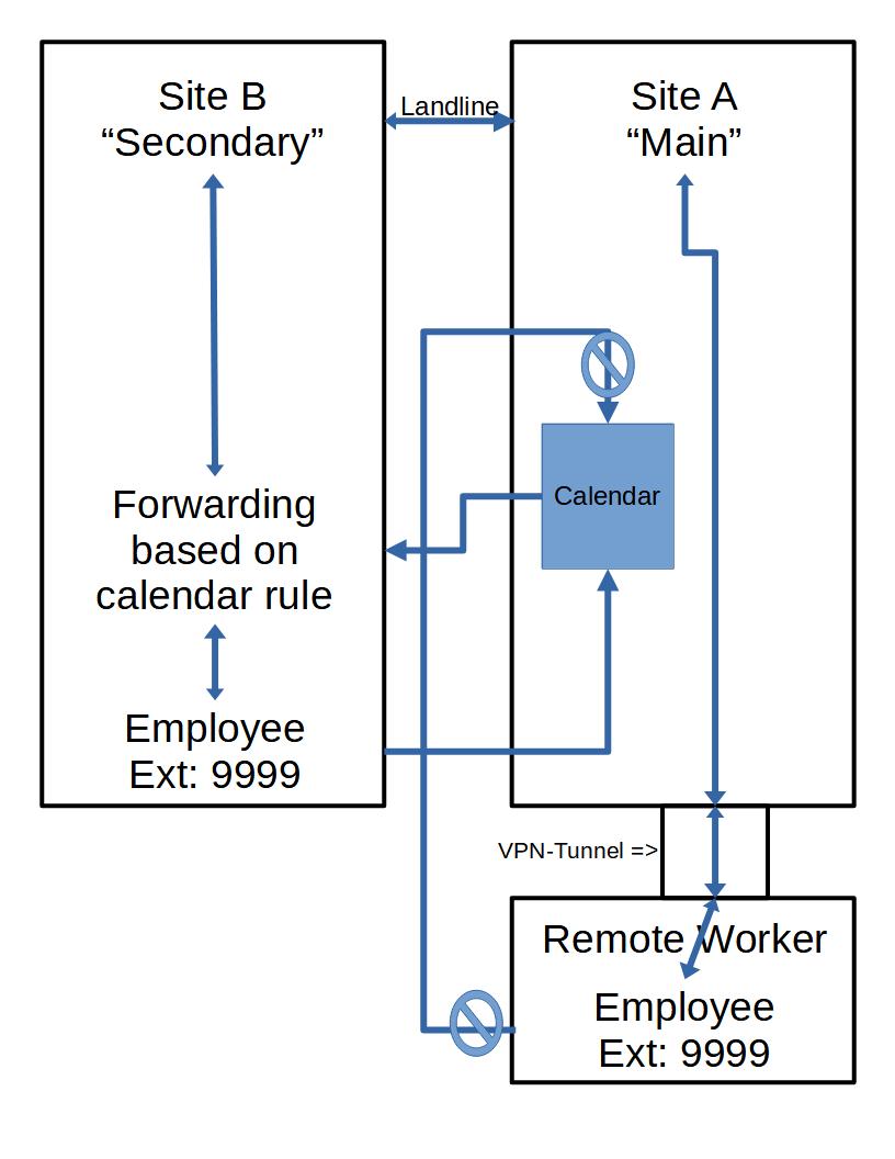 Setup: Two separate PBX sites “A” and “B” are up and running. “A” is the primary site.”B” is the secondary site. Operating Procedures dictate that all VPN connections are going to site “A”. As such remote workers from site “B” have to be reachable by means of forwarding from “B” to “A”. When site “B” connects to the remote worker they can do so by using calendar based forwarding rules of the corresponding extension, B→A→”remote worker”. Challenges arise on how to formulate forwarding rules when the remote worker is “in and out of the office” on an irregular basis.