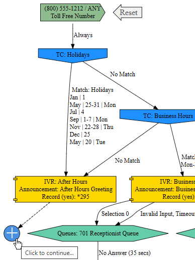 - Choose from Inbound Routes, Time Conditions, Call Flows, IVRs, Queues, Ring Groups, Dynamic Routes, Announcements, Languages, or Misc Applications as a starting point. (modules are optional and will only appear if there is at least 1.–example: Ring Groups module exists, but none exist. Ring Groups will not appear on the dropdown) -no longer limited to Inbound Routes