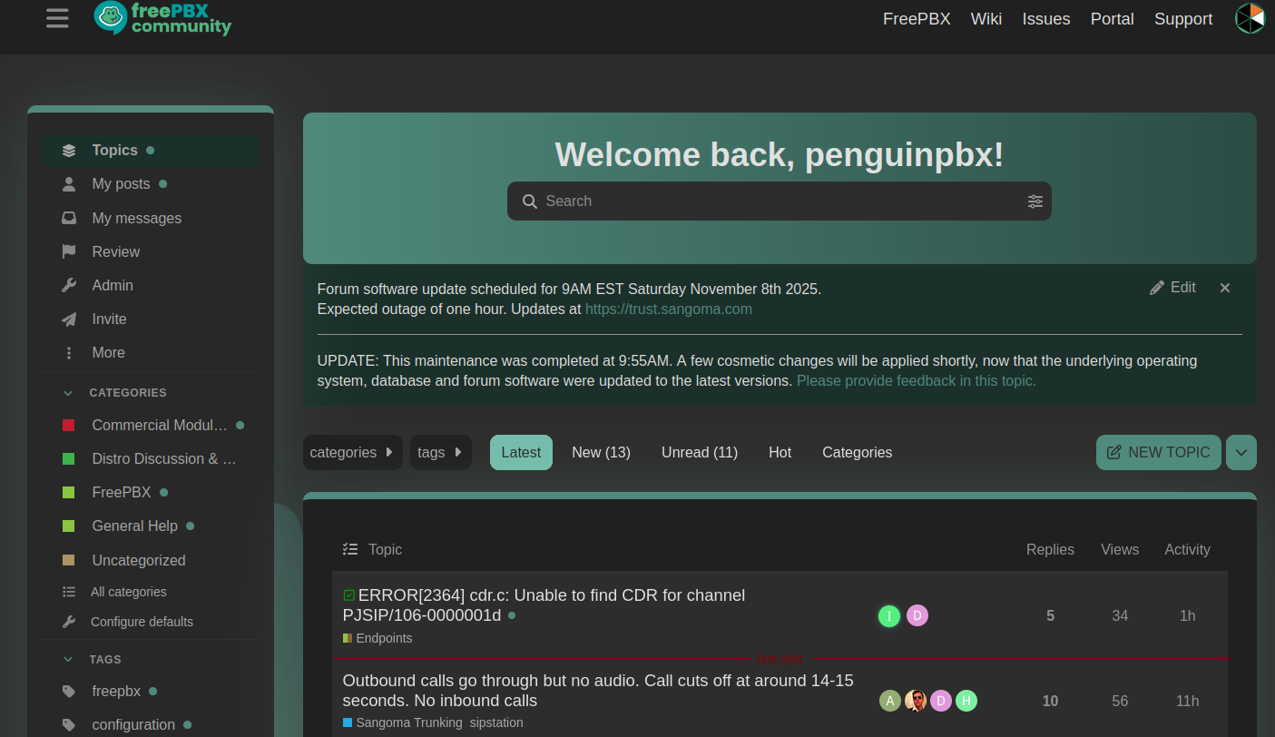 The dark version of the Mint Theme was added - you can switch to it by navigating to your avatar icon, then the person icon, then Preferences tab, then Interface sub-tab - link is in the format https://community.freepbx.org/u/penguinpbx/preferences/interface (changing penguinpbx to your username as appropriate).