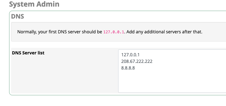 DNS card says “Normally, your first DNS server should be 127.0.0.1. Add any additional servers after that.”
