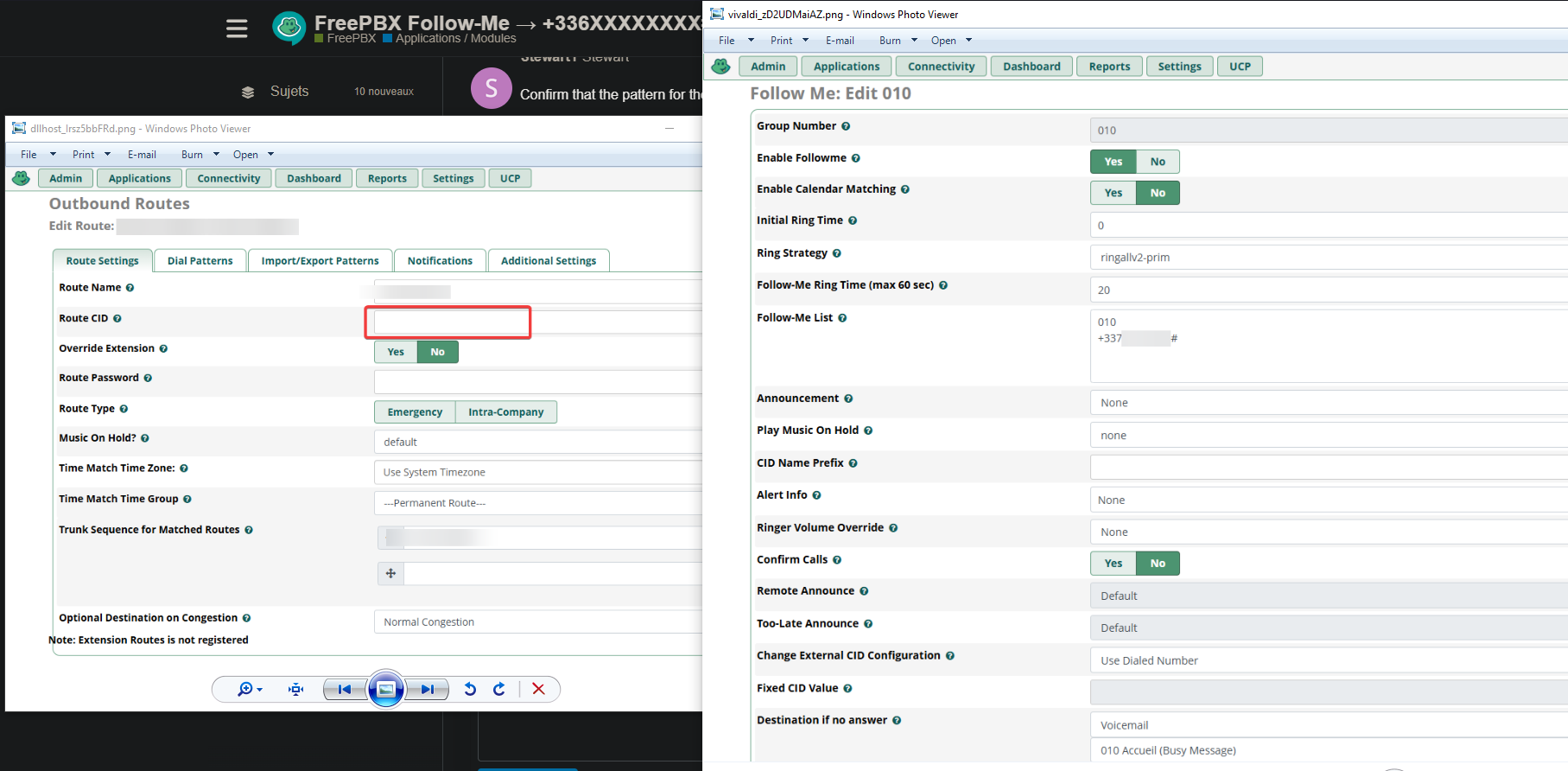 Follow-Me List: 011 +336XXXXXXXX# Confirm Calls: YES Change External CID Configuration: Use Dialed Number Ring Strategy: ringallv2-prim Ring Time: 20 seconds