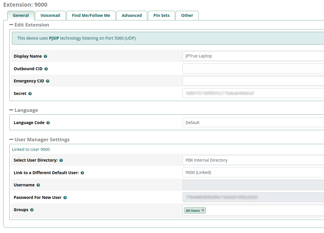 I tried setting up a brand new extension (9000) and set up a Zoiper Softphone on another computer to test… to no avail unfortunately.