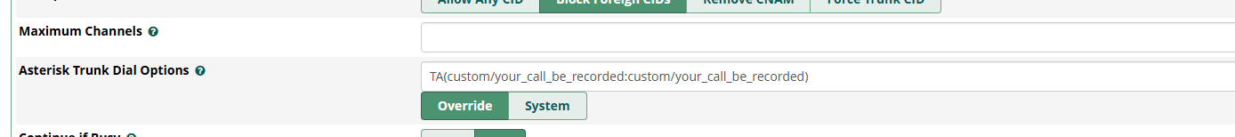 TA(custom/your_call_be_recorded:custom/your_call_be_recorded) on the trunk.