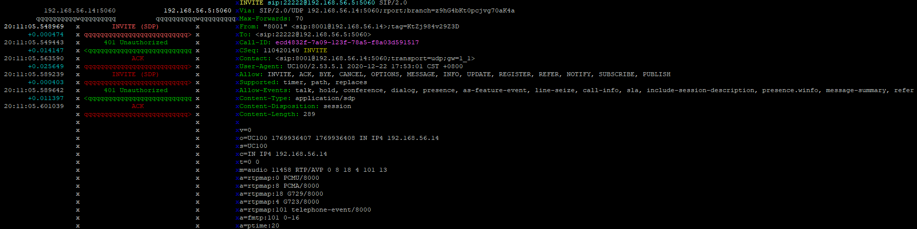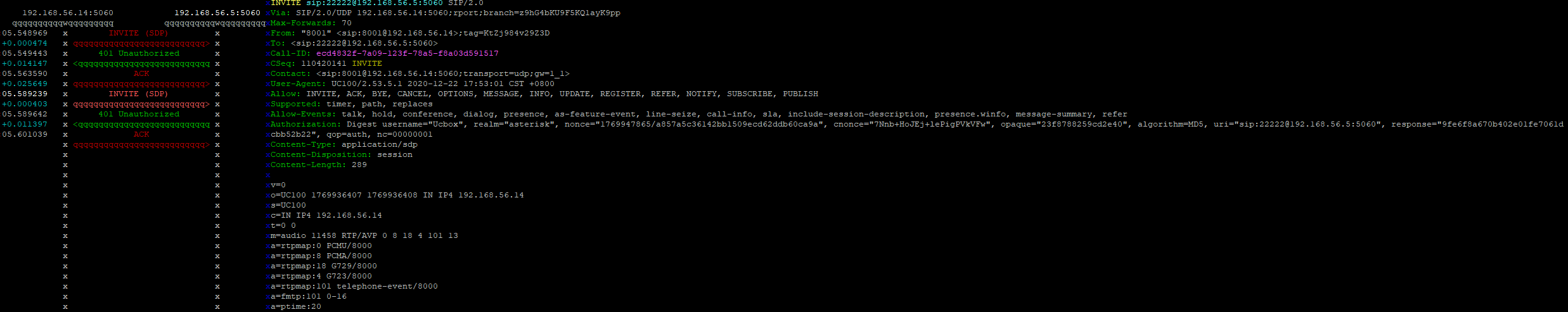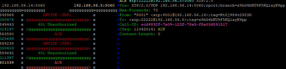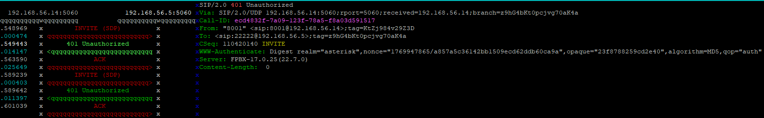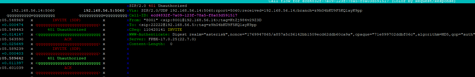 After trying to make a call analog-pstn→fxo→sip trunk - running sngrep this is what it looks like: