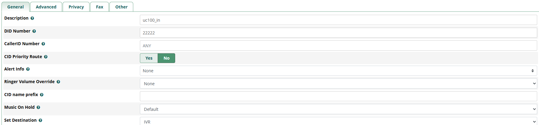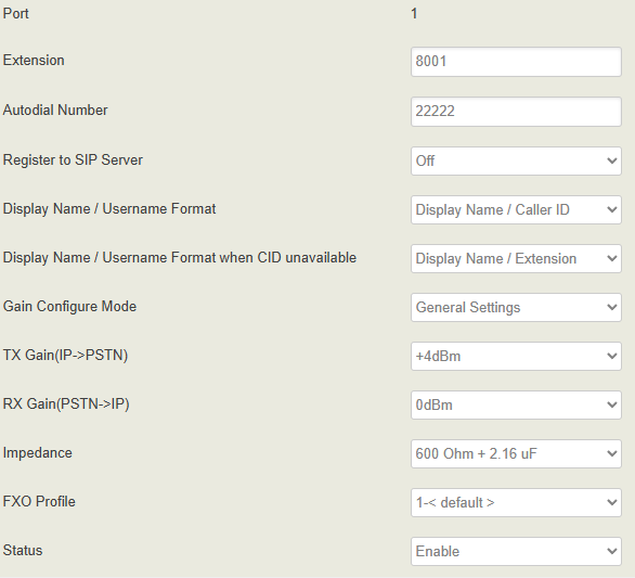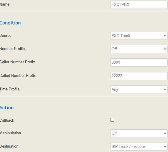 FXO extension is 8001 and it autodials to 22222 which is supposed to be the DID for the inbound route in freepbx. I’ve also tried the following: