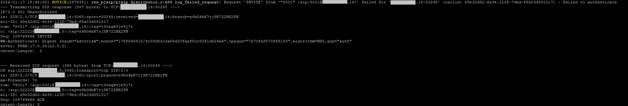 It does seem that Asterisk is failing to recognize the UAC, and the redaction isn’t helping one to see why, nor is the removal of the message that presumably contains the wrong identity (the log doesn’t start at the start of the call).