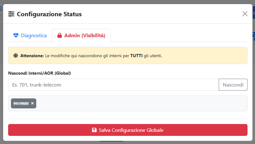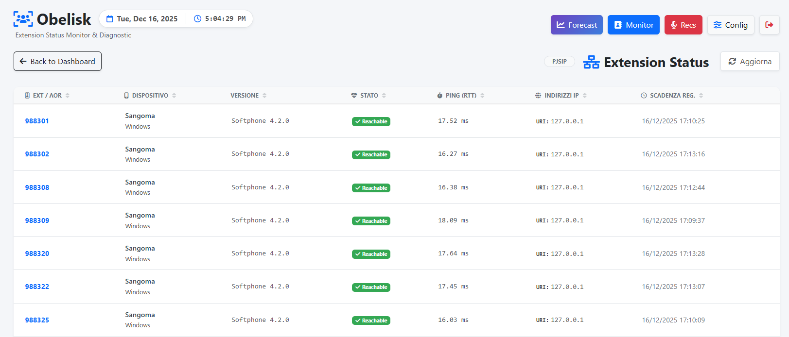 The Extensions section, dedicated to IT, displays the extensions/AORs, the phone model, the installed version, or even the firmware version, such as for broadband phones. This can be useful for determining whether all operators have the latest software or firmware version, the ping time, and the IP address.