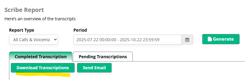 Scribe → View Transcription → Click on tabular view , the select the transcription check box which will enable the download option