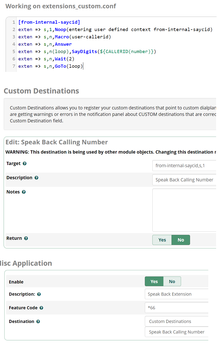I’m afraid I can’t help with your query about why I’m calling it as I don’t understand your question. I think your use of ‘calling’ is system/database related, where my use of ‘calling’ is that I want to dial an extension from my Butt phone when I’m in the frame room and have the extension spoken on repeat until I move on. Other folks here helped me with the config as-was on my old v16 distro and it worked nicely where the the built-in *65 function wasn’t quite what I was after as I didn’t need all the words spoken in front of the extension number.