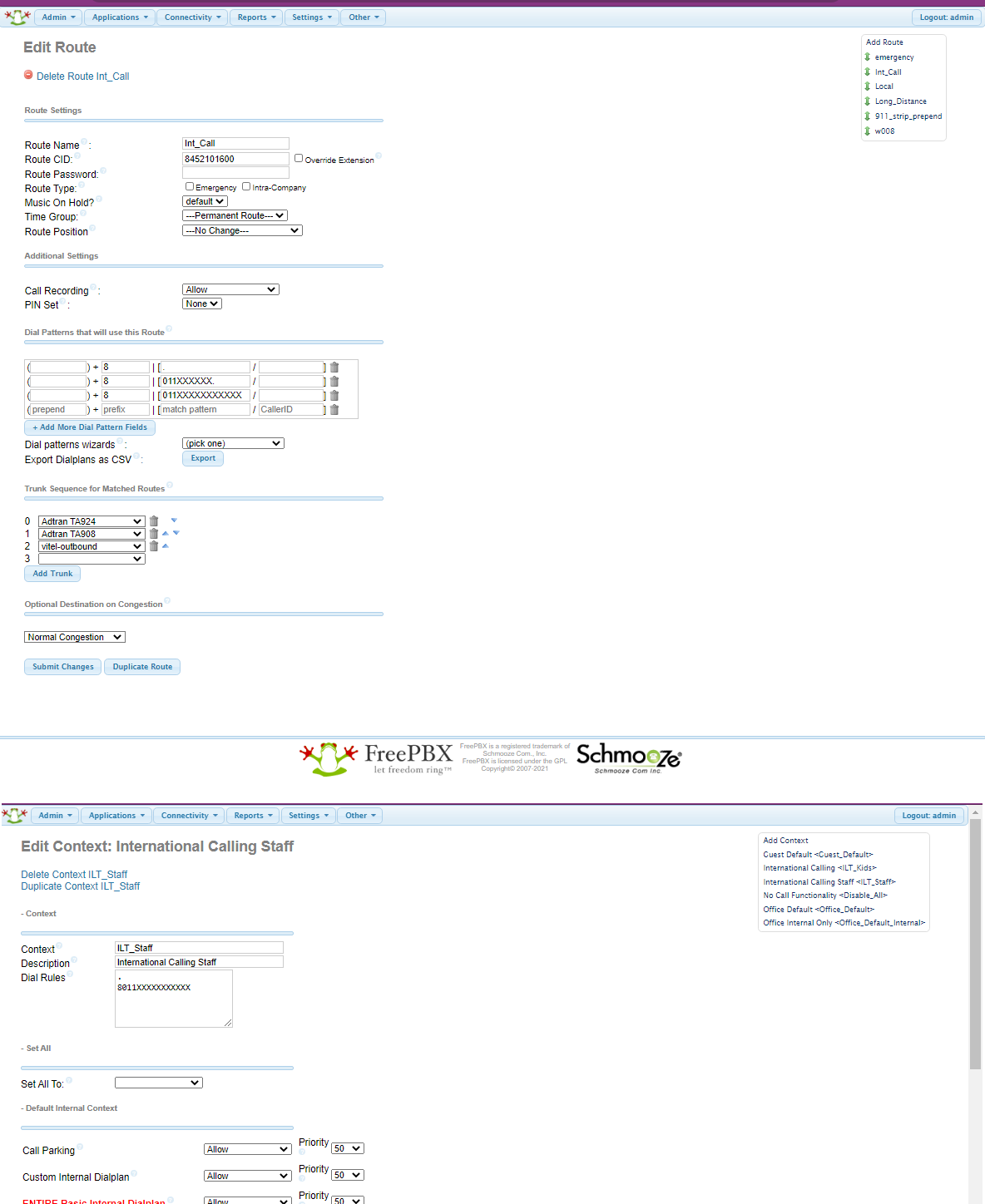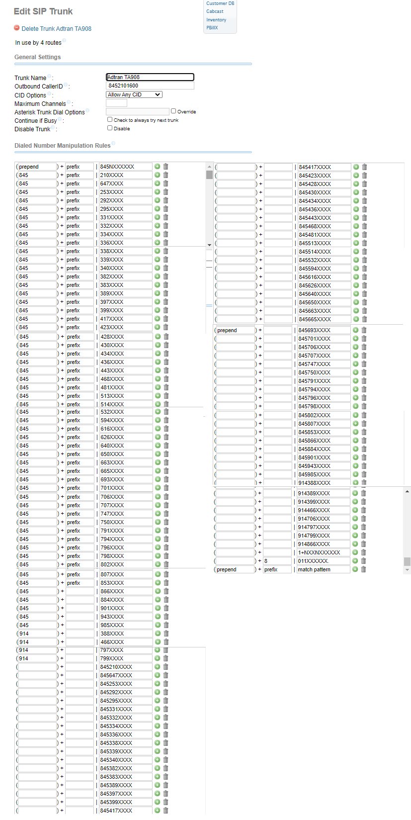 I found the CDR records here, but no proper IDs. Looking at the live feed [ tail-f /var/log/asterisk/full] Shows the call out right not fully dialing out. It gets stuck at the 6th digit or (when dialing with 81 instead of just 8) goes up to the 10th digit. It appears to fail when hitting the Adtran 908 and says busy when going to the outbound line. I’ll attach an image of the 2 trunks with my next responce
