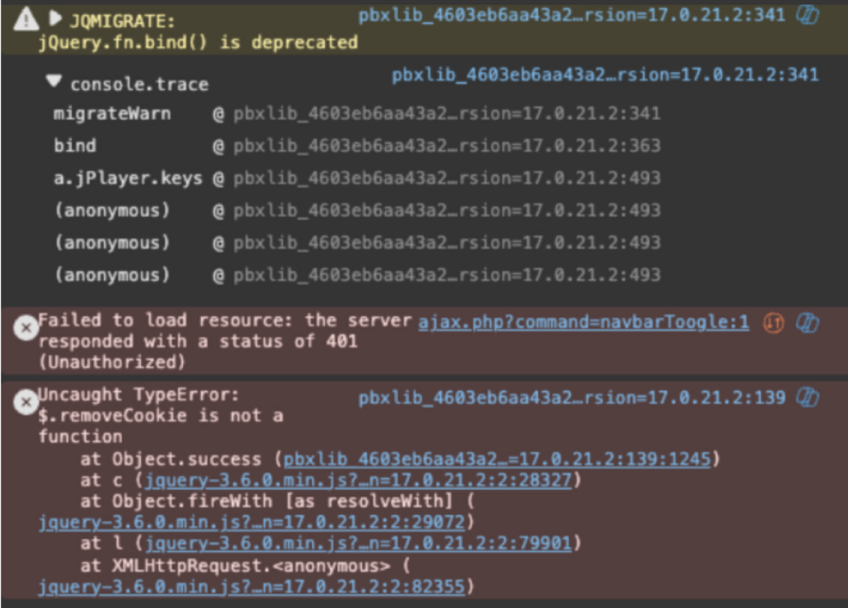 After restoring from a full disk backup, the $.removeCookie TypeError is also raised, but I can log in successfully once again. Where as post upgrade, there is no http request made when I click ‘Continue’. Presumably this issue is connected with changes to clientside JS some point after core-17.0.18.34 and/or framework-17.0.21.
